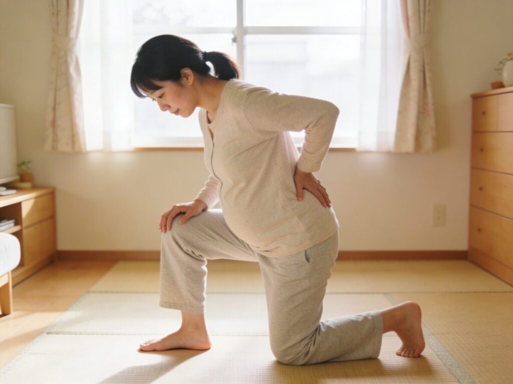 まず片膝を立て、手を膝の上に置いてから体を支えながらゆっくり立ち上がる「片膝立ちからの起立」が、腰への負担を分散させるうえで効果的です。授乳後や朝起き上がるときなど、特に痛みが出やすい場面でぜひ意識してみてください。